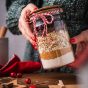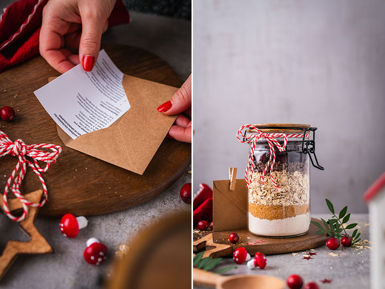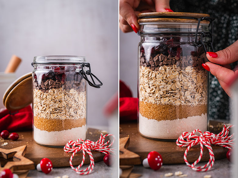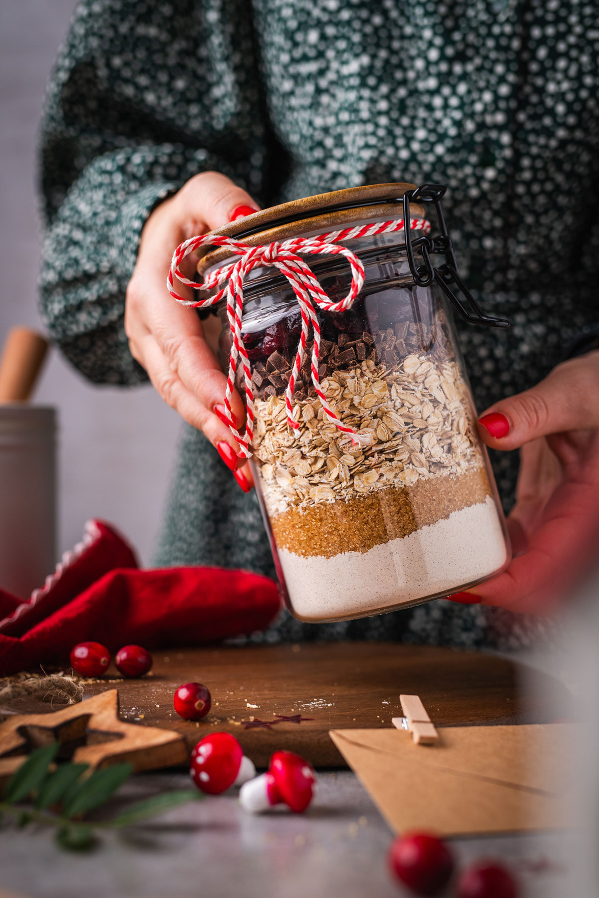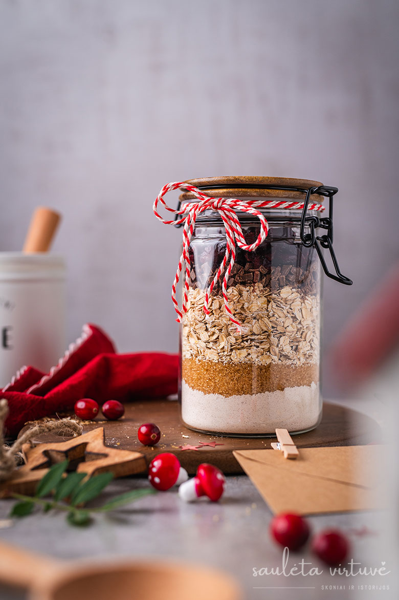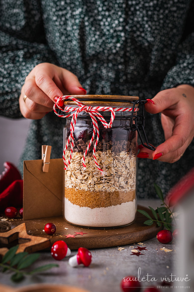 Dailiame stiklainyje susluoksniuokite sausus ingredientus, o prie dovanos pridėkite mažą kortelę ar atviruką, kuriame surašykite, kaip juos paversti kvapniais, gardžiais sausainiais. Dažniausiai, kaip ir šiuo atveju, prireiks vos vieno papildomo žingsnio – įmaišyti minkšto sviesto ir kiaušinį. Keliolika minučių orkaitėje – ir sausainiais kvepės visi namai!