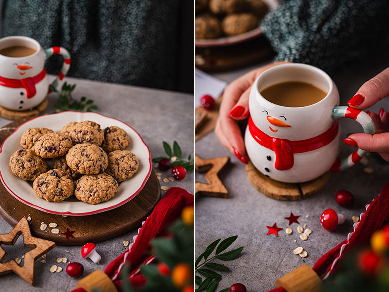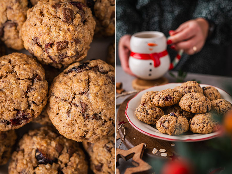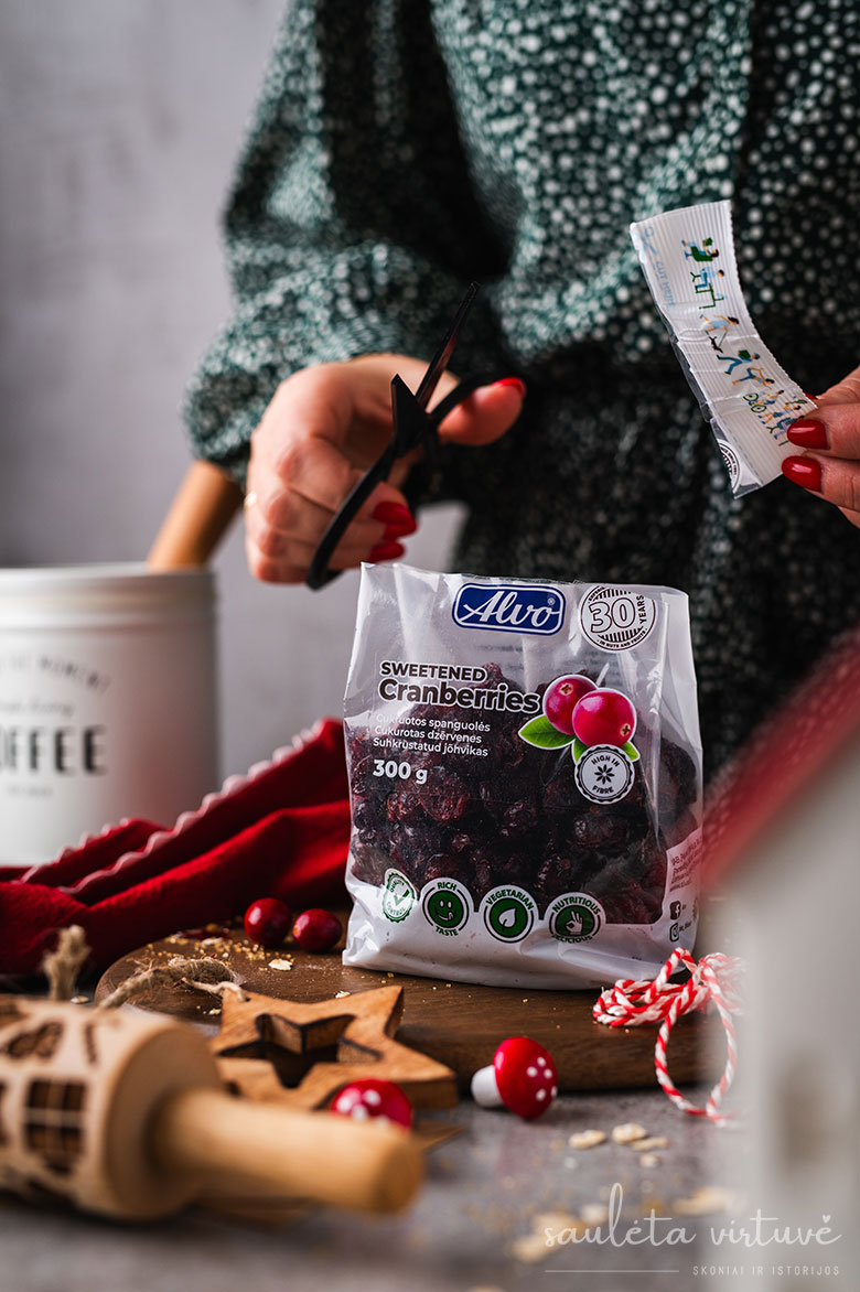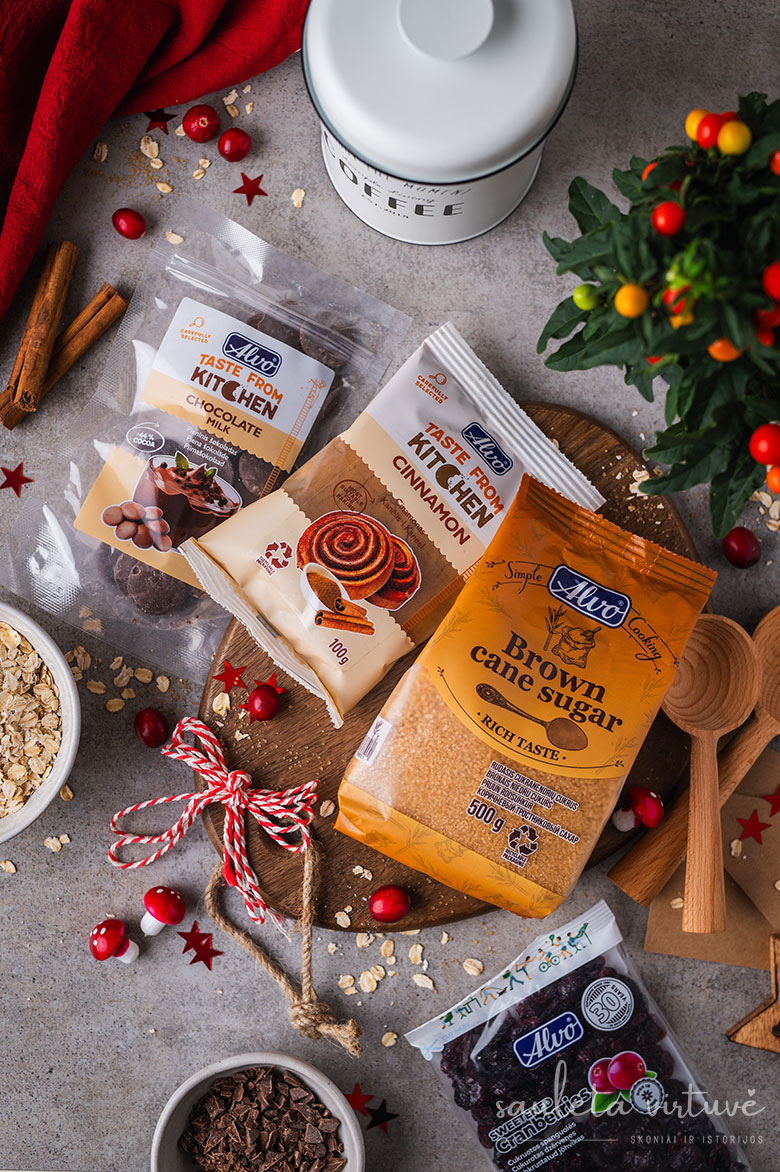 Šie avižiniai sausainiai – puikūs. Šiek tiek traškūs išorėje ir minkšti viduje, pagardinti „Alvo“ pieniško šokolado gabalėliais ir cukruotomis spanguolėmis. Šaukštelis malto cinamono suteikia jiems šilto skonio ir aromato, ir jaukios Kalėdų nuotaikos.