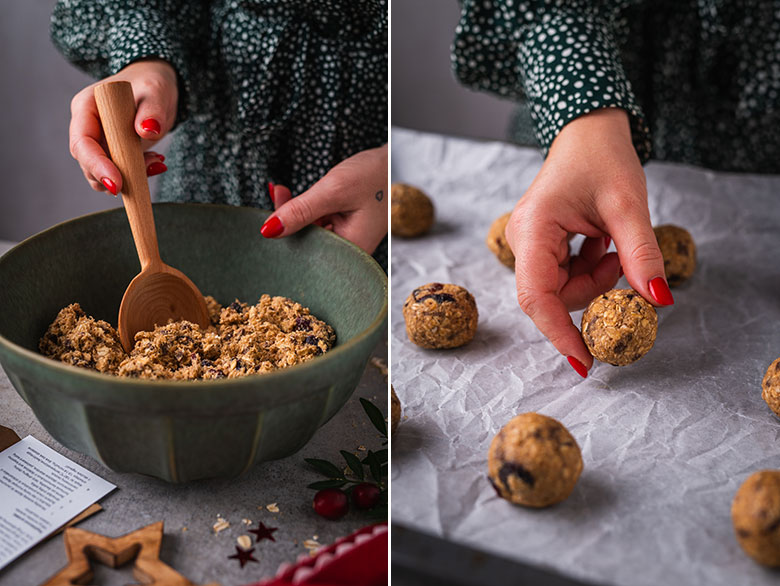4. Semkite po šaukštą, tarp drėgnų delnų formuokite kamuoliukus ir išdėliokite ant kepimo popieriumi išklotos skardos, paliekant kelių centimetrų tarpus.