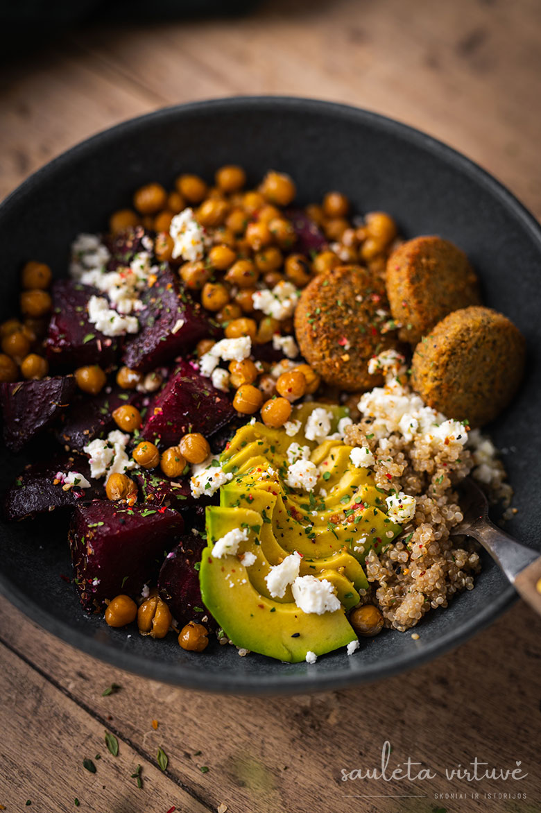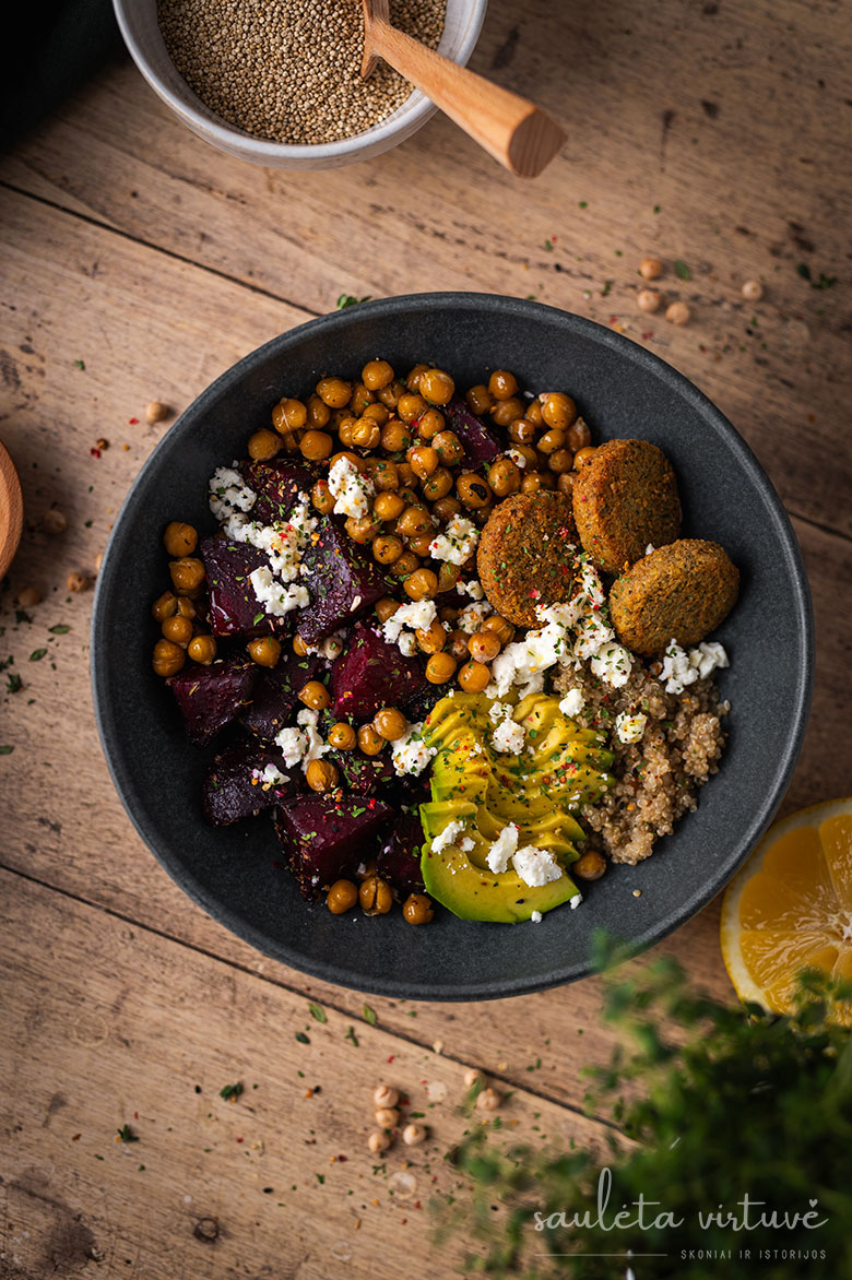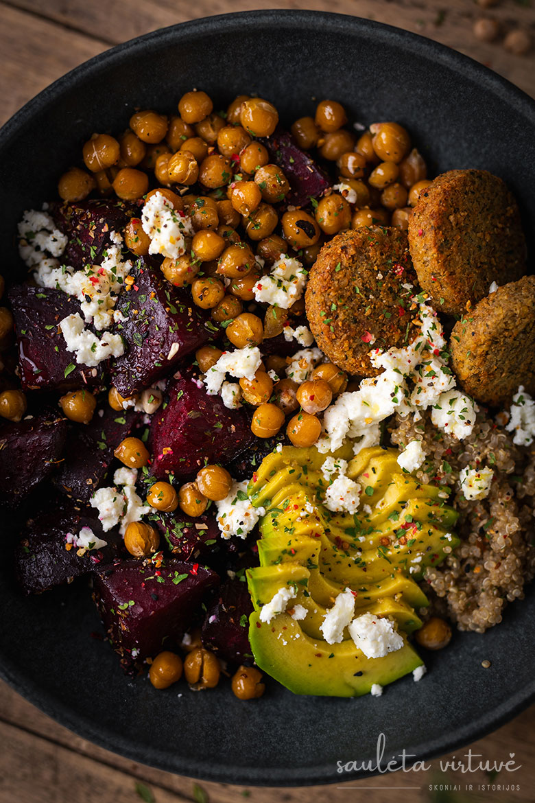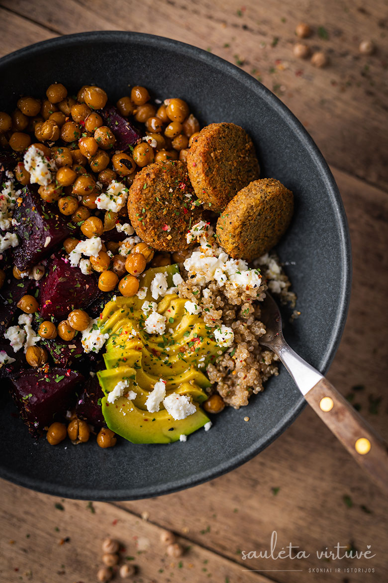 5. Į du dubenėlius padalinkite bolivinę balandą, keptus burokėlius, avinžirnius ir falafelius.
