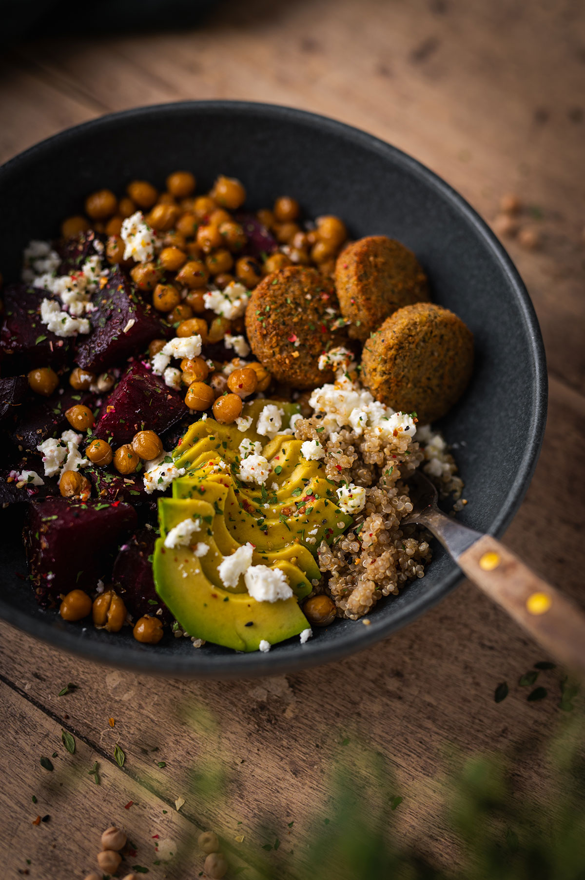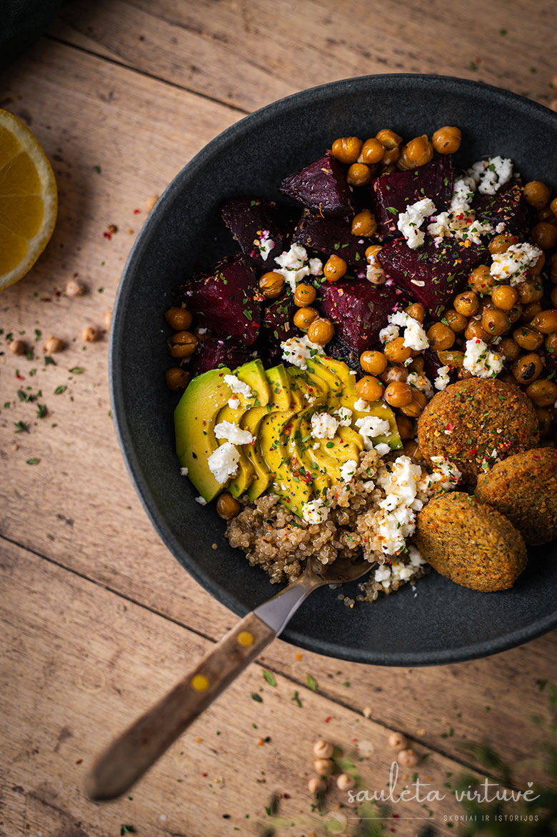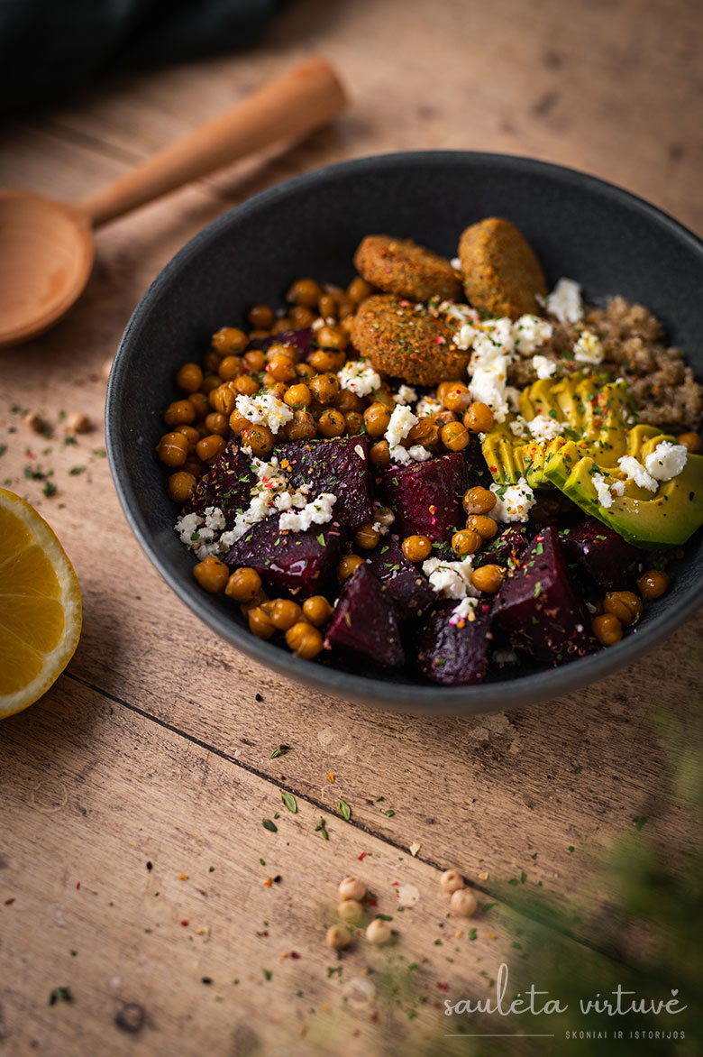 5. Į du dubenėlius padalinkite bolivinę balandą, keptus burokėlius, avinžirnius ir falafelius.