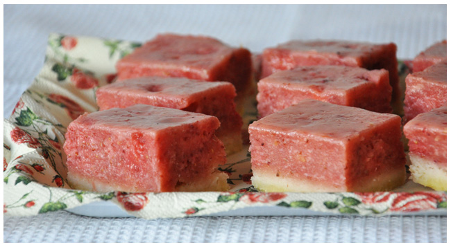 Skonis: 9,5/10. Šiek tiek neįprastos konsistencijos – nei tai pyragas, nei tai pudingas, nei kažkas dar, ką būtų labai lengva žodžiais apibūdint… – tačiau tuo ir žavus. Ir dar tuo, kad gausiai braškinis ir maloniai citrininis tuo pat metu. Vienintelė bėda, kad pyragą geriau laikyti šaldytuve, nes vasariškoje kambario temperatūroje braškinis sluoksnis yra linkęs minkštėti ir šiek tiek gąsdinti „ištirpimu”.