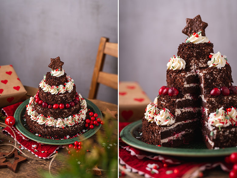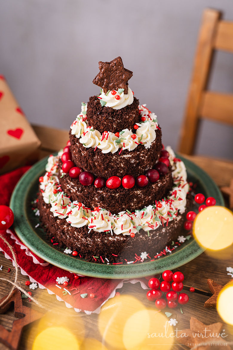 Nors galite rinktis pačius įvairiausius biskvitų ir kremų derinius, klasikinis, sodraus skonio „Juodasis miškas“ čia tinka nepriekaištingai. Saldūs šokoladiniai biskvitai, švelnus maskarponės kremas ir saldžiarūgštės vyšnios sukuria harmoningą, šventinį skonį. Jei vis tik norėsite eksperimentuoti, atkreipkite dėmesį – biskvitai turėtų būti kuo lengvesni, o kremas pakankamai tvirtas, kad daugiasluoksnis tortas išliktų stabilus ir tvirtai laikytų eglutės formą.