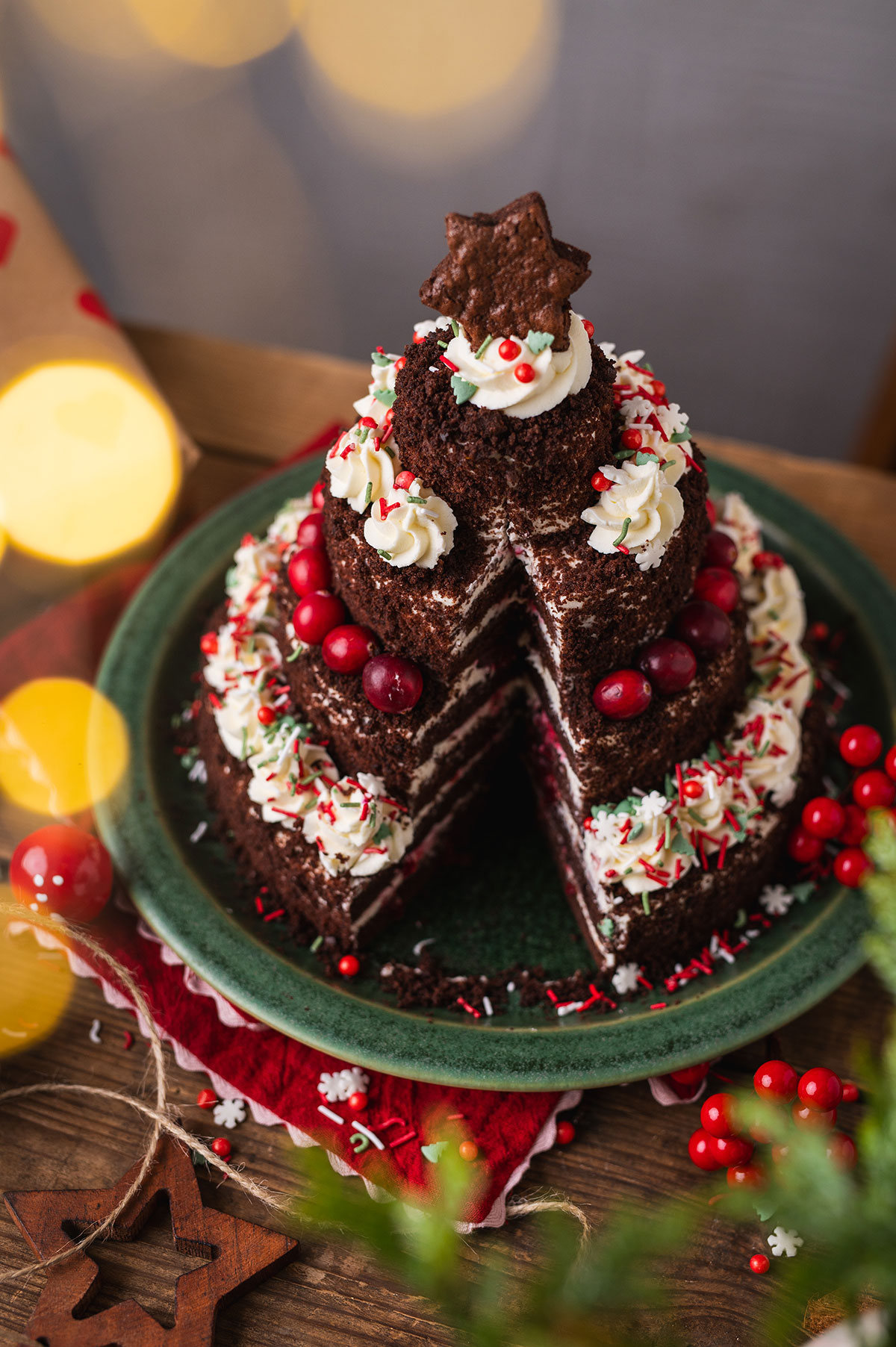 22. Apiberkite spalvotais pabarstukais, papuoškite spanguolėmis. Tortui-eglutei uždėkite viršūnę – į kremo kauburėlį įspauskite biskvitinę žvaigždutę.