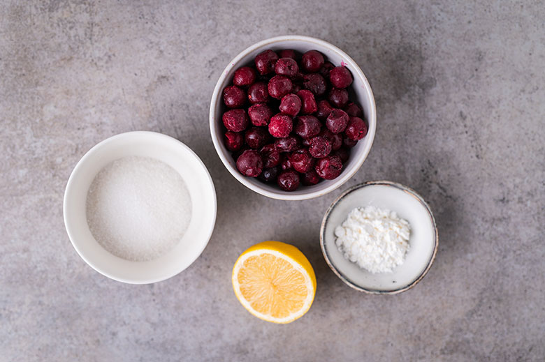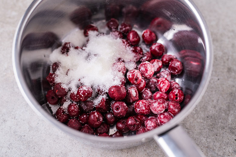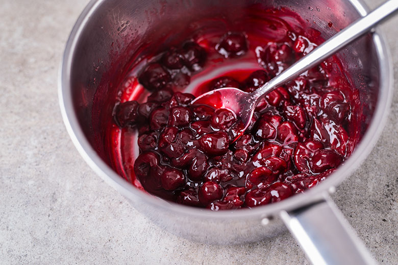 10. Vyšnias, citrinos sultis, cukrų ir kukurūzų krakmolą sudėkite į nedidelį puodą. Kaitinkite virš vidutinio dydžio ugnies, kol užvirs. Sumažinę ugnį iki silpnos, maišydami pakaitinkite, kol vyšnios sutirštės. Atvėsinkite.