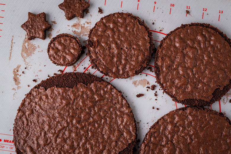 8. Taip pat iškepkite ir antrąjį biskvitą. Iš jų išpjaukite skirtingo skersmens apskritimus (kiekvieno dydžio – po 2 vnt.): 20 cm, 13 cm, 10 cm ir 5 cm skersmens. Jei neturite konditerinių žiedų, tam puikiai pasitarnaus atitinkamo skersmens lėkštės ar dubenėliai – dėkite juos ant atvėsusio biskvito ir apipjaukite aštriu peiliu. Sausainio formele išspauskite žvaigždutę – bus torto viršūnė. Likusius biskvitus atidėkite – panaudosite papuošimui.