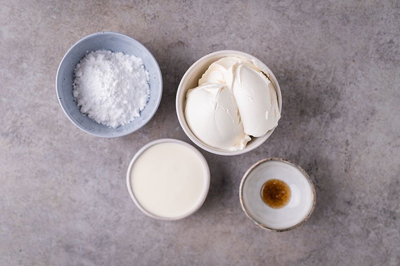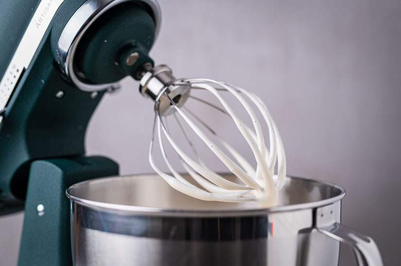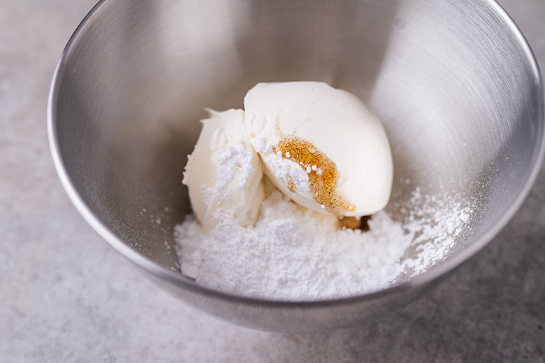 12. Dubenyje elektriniu plaktuvu trumpai išplakite maskarponę, miltelinį cukrų ir vanilės pastą – plakite tik tol, kol produktai susimaišys.