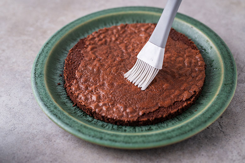 14. Surinkite tortą. Ant lėkštės, tortinės ar padėklo dėkite pirmąjį didžiausio skersmens biskvitą. Švelniai apšlakstykite vyšnių sultimis.