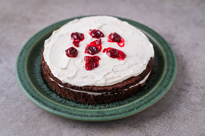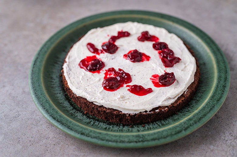 16. Ant viršaus dėkite antrąjį biskvitą, lengvai paspauskite delnais. Taip pat plonai aptepkite maskarponės kremu ir išdėliokite kelias vyšnias.