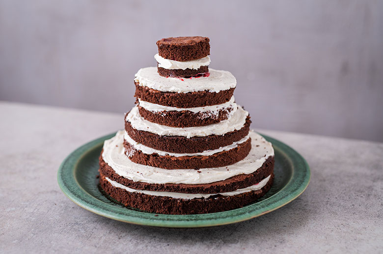 17. Taip susluoksniuokite visus biskvitus, kiekvieną švelniai apšlakstydami vyšnių sultimis, plonai aptepdami kremu ir vyšniomis.