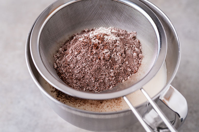 4. Atskirame dubenyje sumaišykite miltus, kepimo miltelius, druską ir kakavos miltelius. Įsijokite į kiaušinių plakinį ir lengvai išmaišykite mentele.