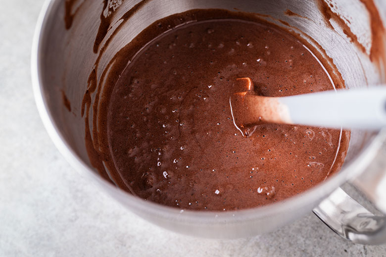 5. Supilkite aliejų ir kavą ir įmaišykite. Maišykite lengvais judesiais, stenkitės neprarasti tešlos tūrio ir purumo.