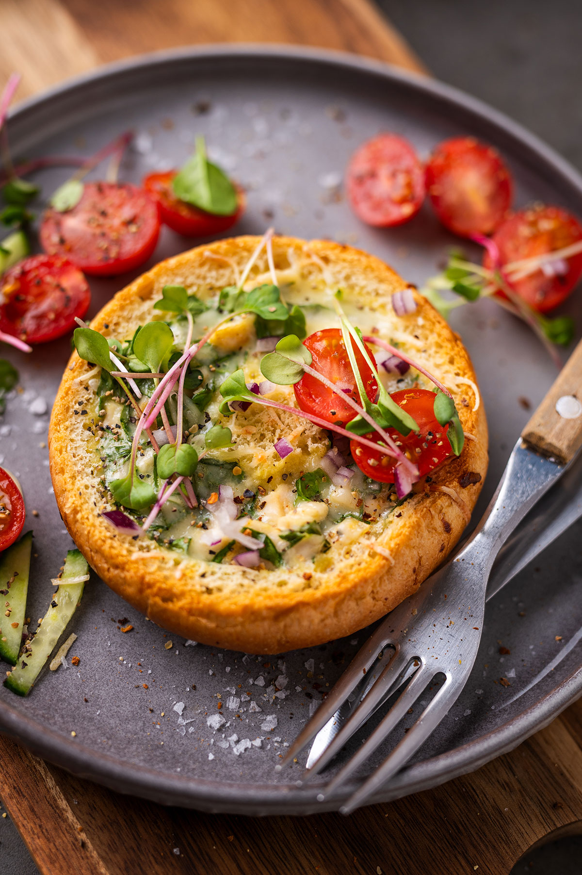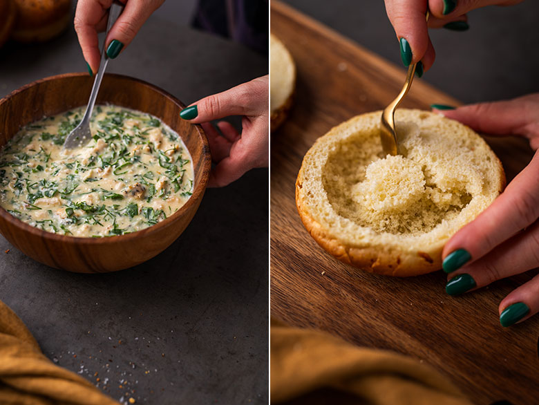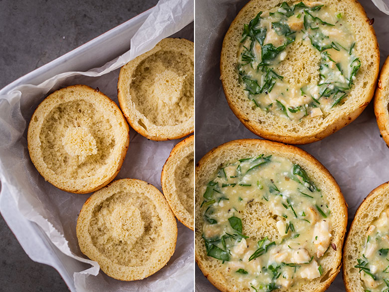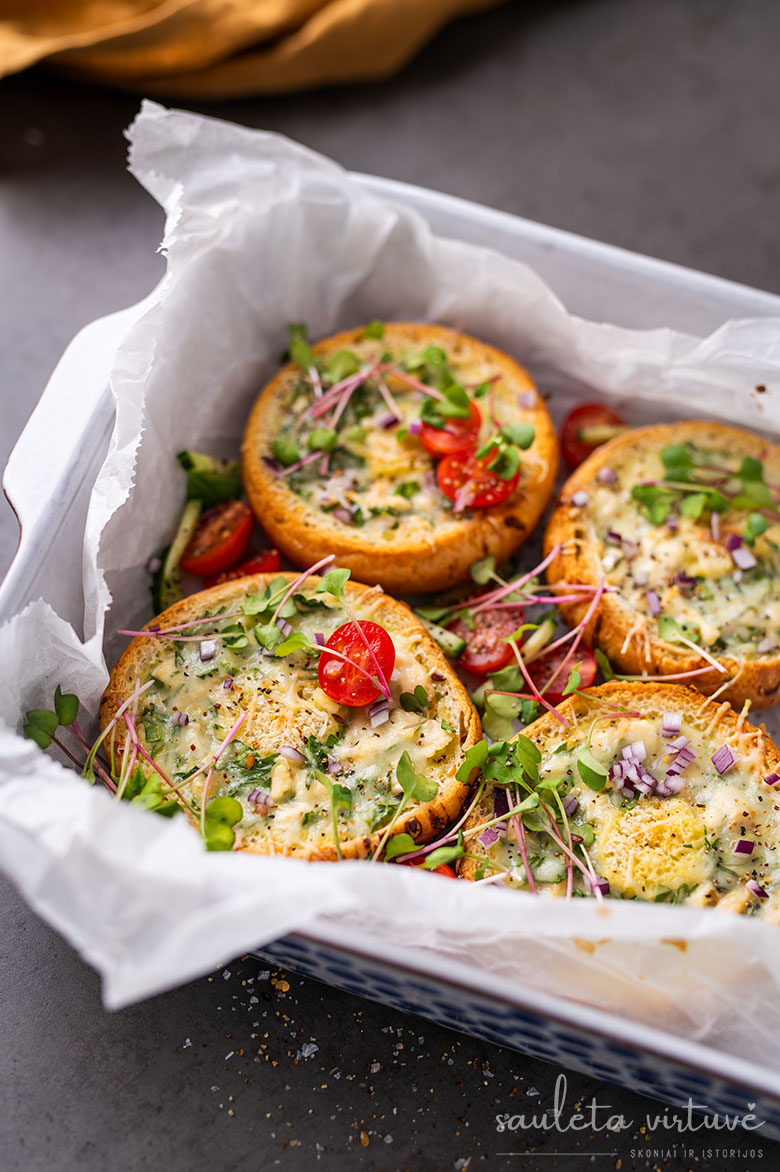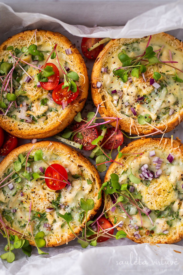 Tai tobulas receptas, jei norisi pamaitinti minią – pririkiuokite riestainių pilną kepimo skardą, kiekvieną išskobkite, pripildykite įdaro ir pašaukite į orkaitę. Po dvidešimties minučių galėsite dalinti į lėkštes šeimai ar draugams, o dar po dešimties turbūt bus belikę trupiniai. Nes tikrai labai skanu!