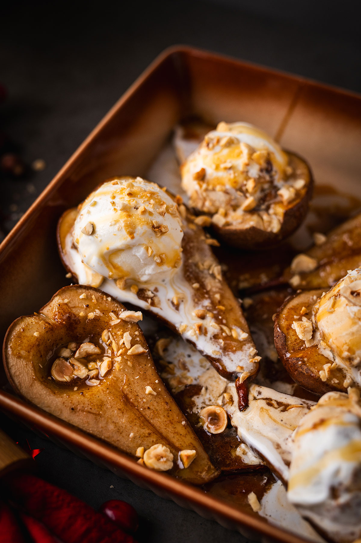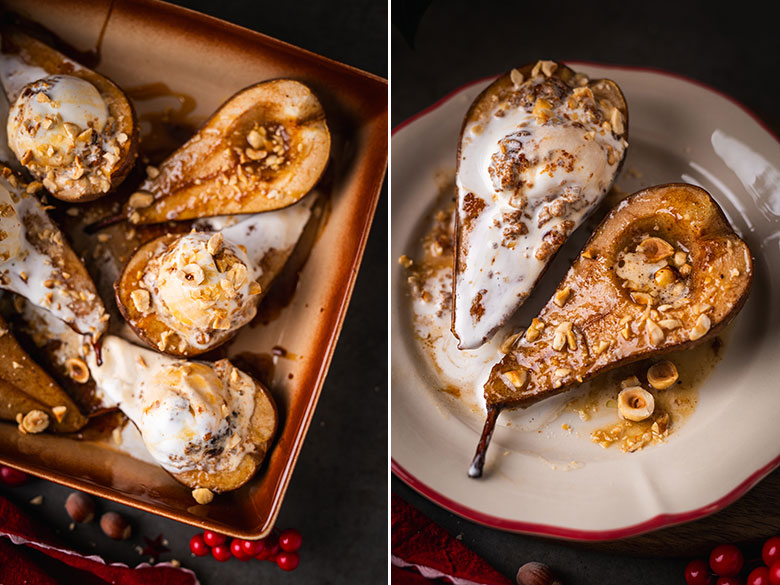 Kriaušes galite pasiruošti iš anksto, o į orkaitę jas pašausite vidury namus užpildžiusio kalėdinio šurmulio. Orkaitė atliks visą darbą – kai kriaušės suminkštės, dalinkite jas į lėkšteles ir nieko nelaukdami ant kiekvienos kriaušės puselės guldykite po rutuliuką ledų.