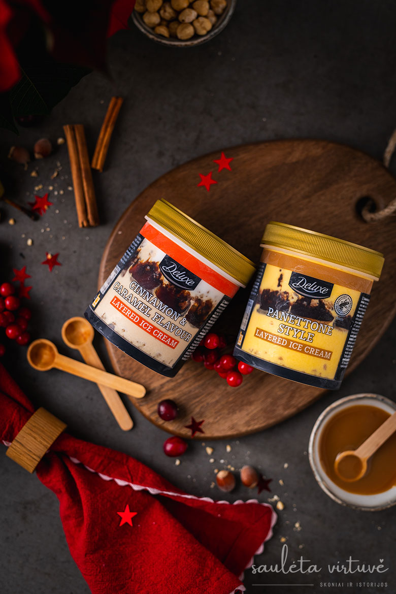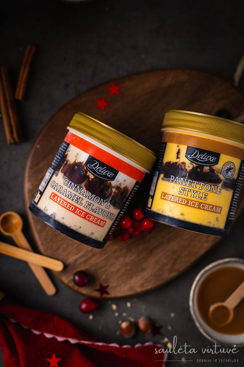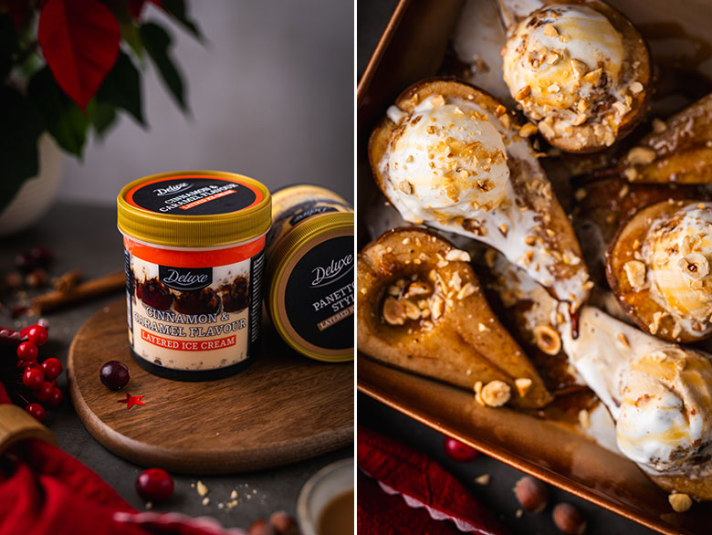 Ledus galite rinktis mėgstamiausius, bet turiu rekomendaciją, kuris keptą kriaušių desertą pavers stebuklingai skaniu. „Lidl Lietuva“ šventiniame „Deluxe“ asortimente yra sluoksniuotų cinamoninių-karamelinių ledų. Jie pilni skonio ir sluoksniuose atsiskleidžiančių skirtingų tekstūrų – ne tik fantastiškai skanūs vieni patys, bet ir tobulai dera su keptomis kriaušėmis.