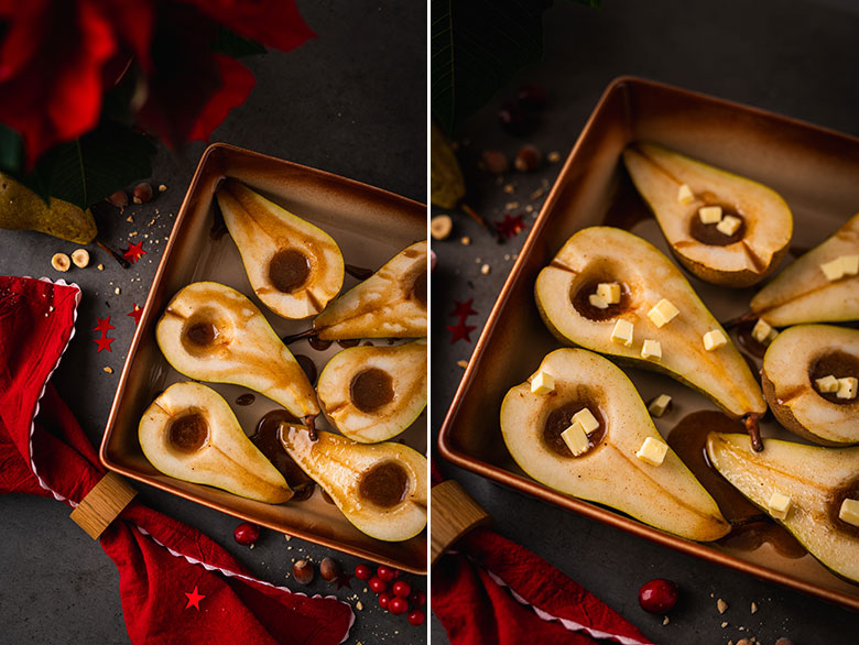 2. Kriaušes perpjaukite perpus. Šaukšteliu išskobkite kriaušių sėklalizdžius. Sudėkite į kepimo indą (perpjauta puse į viršų).