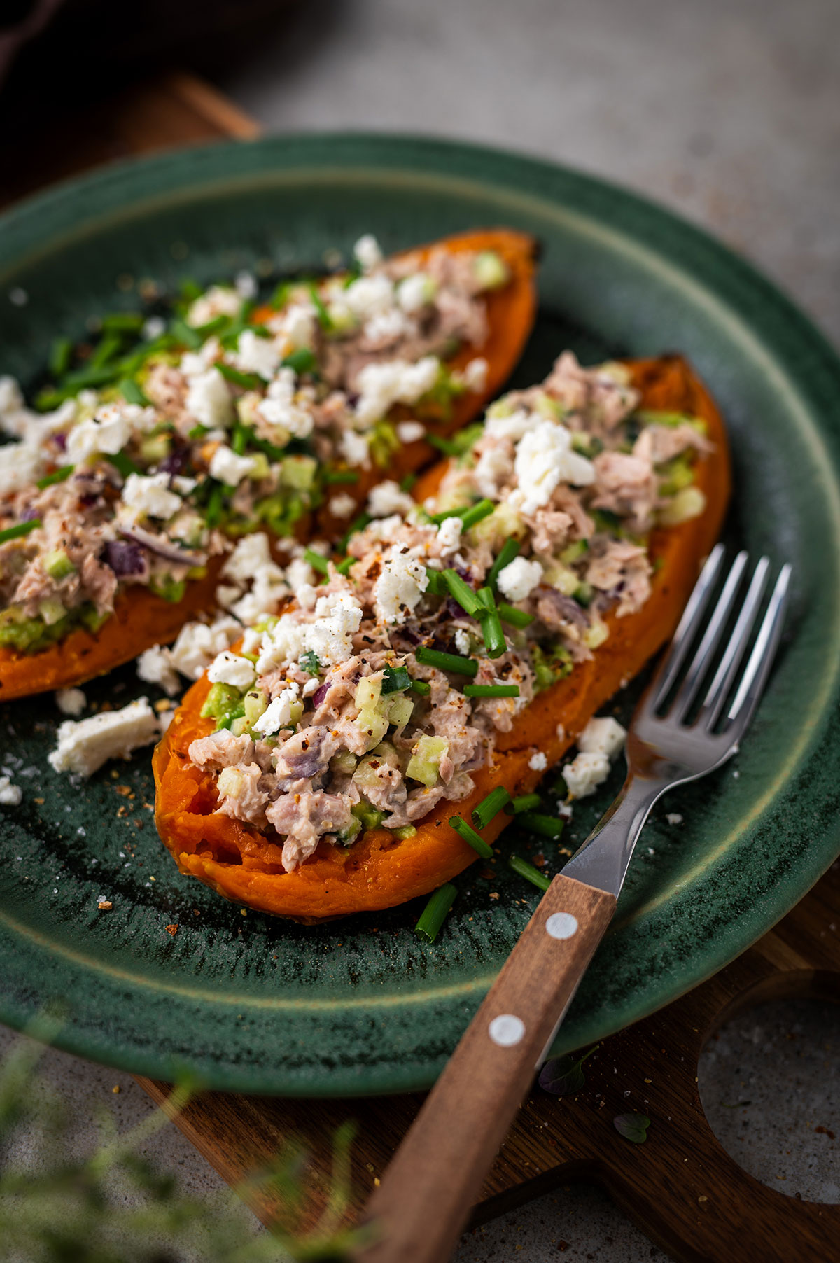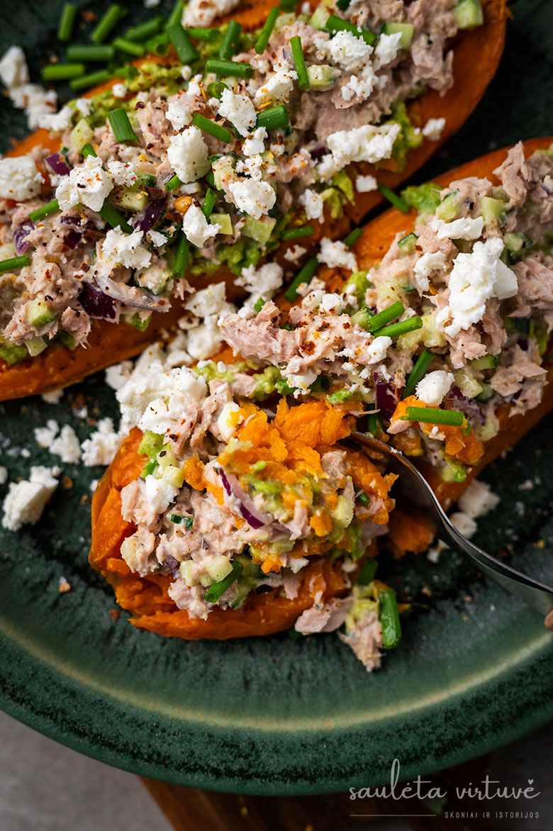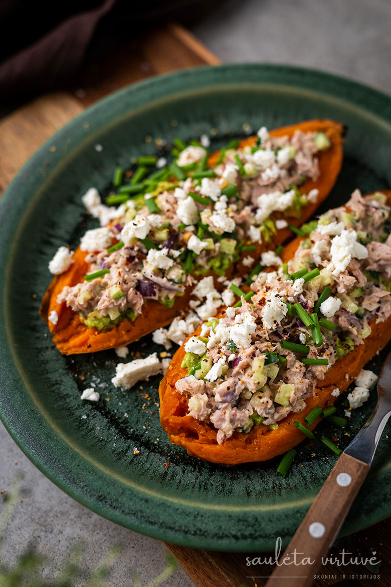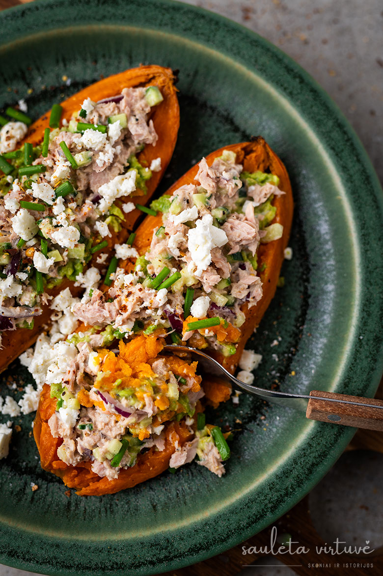 Keptos saldžiosios bulvės su avokadais ir tunu