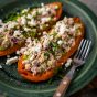 4. Keptą saldžiąją bulvę perpjaukite pusiau, minkštimą lengvai patrinkite šakute. Paskleiskite trintus avokadus, ant jų – tuną.