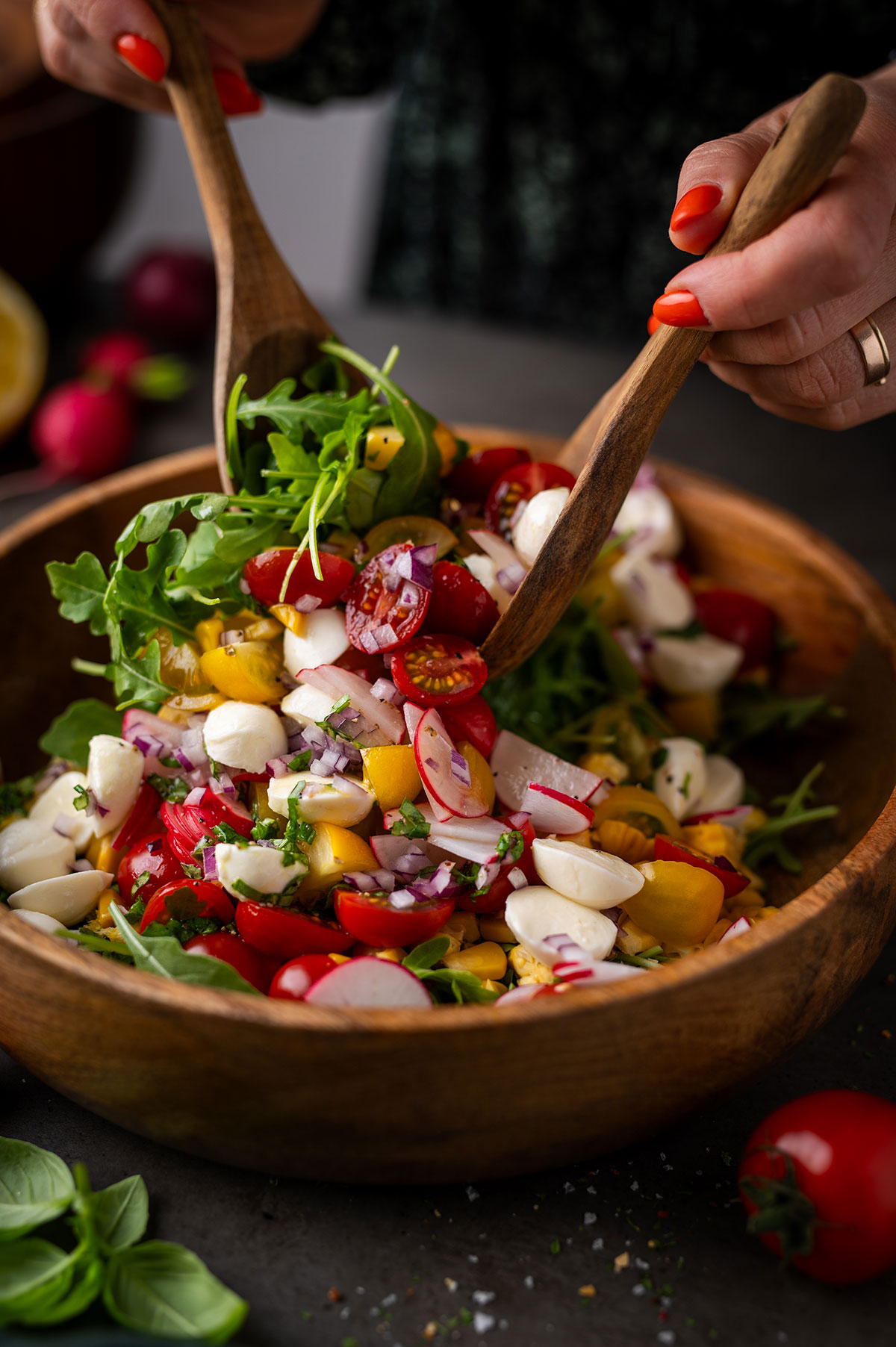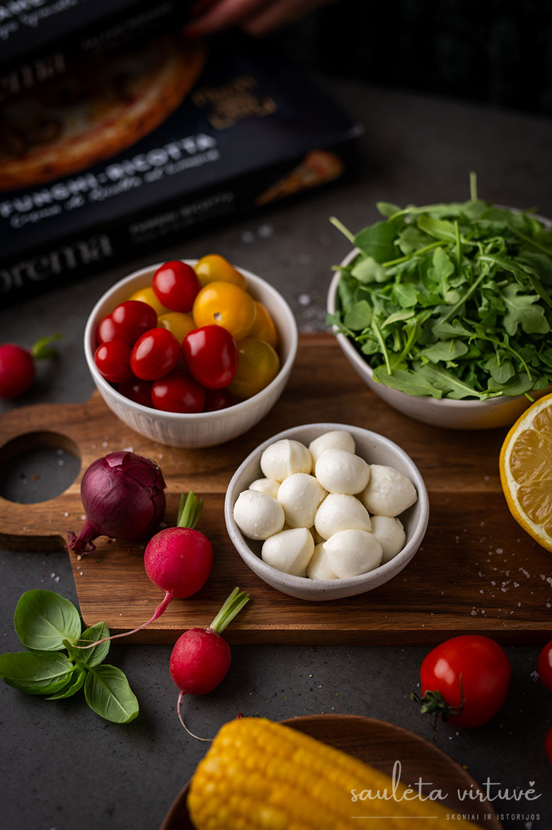 3. Pomidoriukus perpjaukite perpus, ridikėlius – plonomis riekelėmis, raudonąjį svogūną smulkiai supjaustykite. Mocarelos rutuliukus perpjaukite perpus.