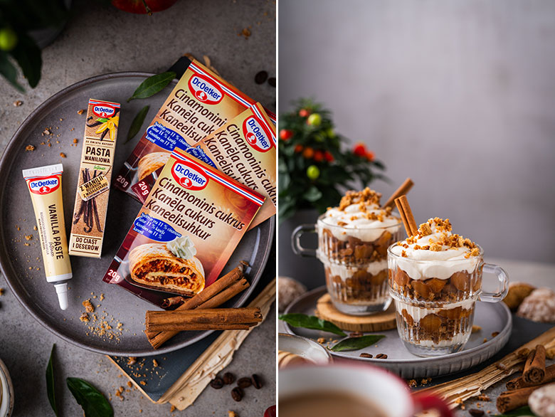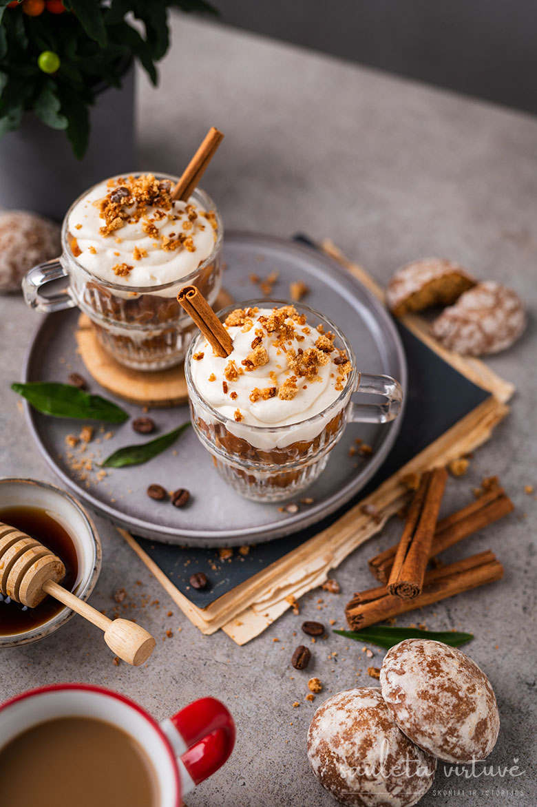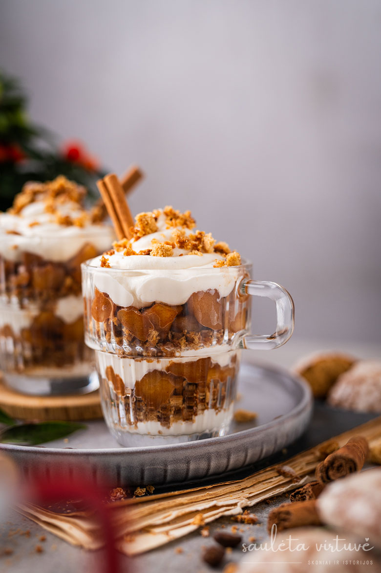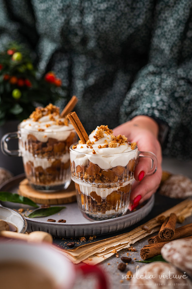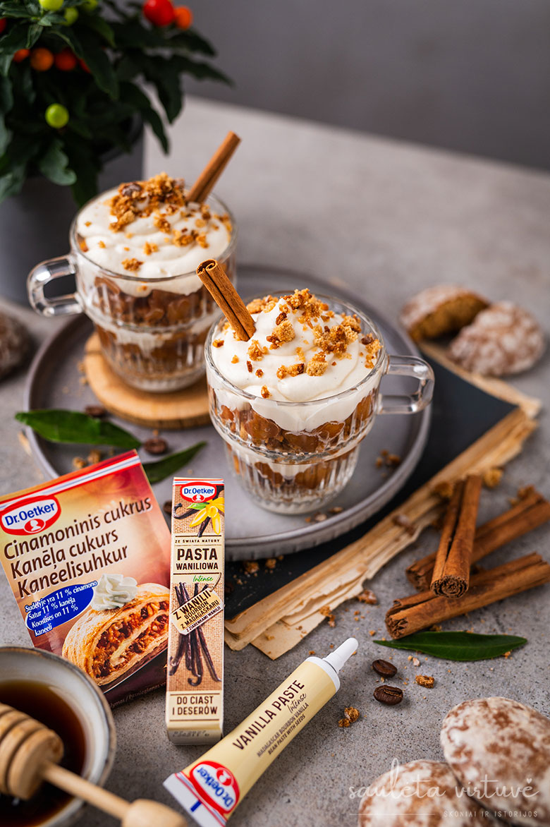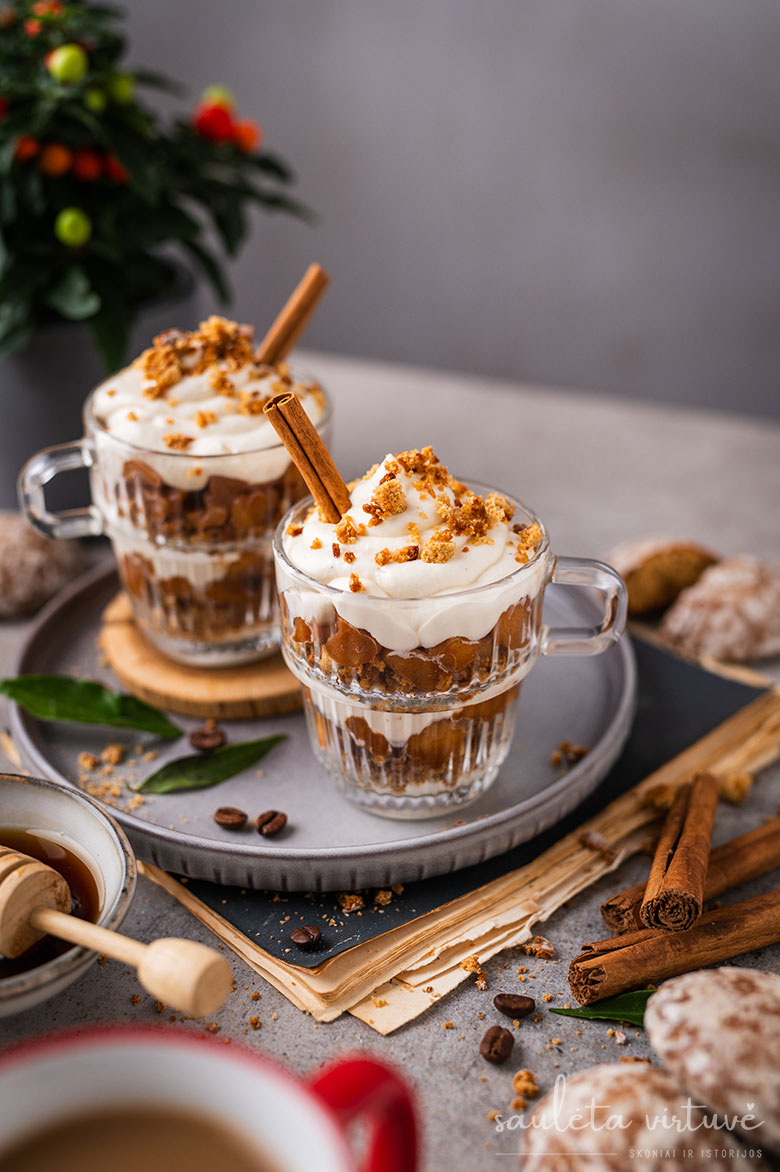 5. Susluoksniuokite maskarponės kremą, meduolių trupinius ir keptus obuolius. Baikite kremo sluoksniu. Apiberkite trupučiu trupinių, papuoškite cinamono lazdele.