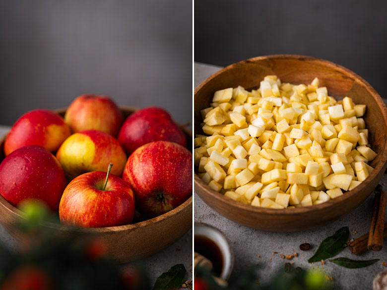 1. Iškepkite obuolius. Nulupkite odeles, išpjaukite sėklalizdžius ir supjaustykite nedideliais kubeliais. Sumaišykite su cinamoniniu cukrumi ir citrinos sultimis.