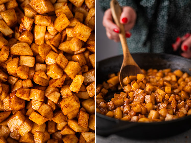 2. Keptuvėje virš vidutinės ugnies ištirpinkite sviestą. Sudėkite obuolius ir kepkite, vis pamaišydami, kol obuoliai suminkštės. Nukaiskite ir atvėsinkite.