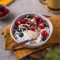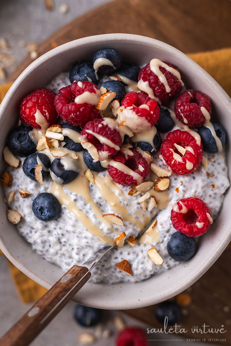 3. Patiekite su migdolų kremu, šviežiomis uogomis, smulkintais riešutais.