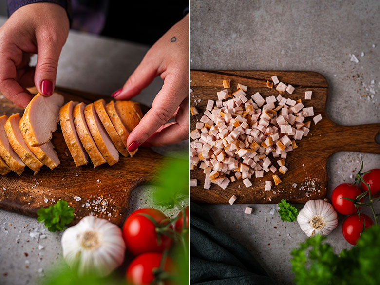 2. Karštai rūkytą vištienos krūtinėlę supjaustykite mažais kubeliais. Sumaišykite su tarkuotu sūriu, majonezu, tarkuota česnako skiltele ir žiupsnių pipirų.