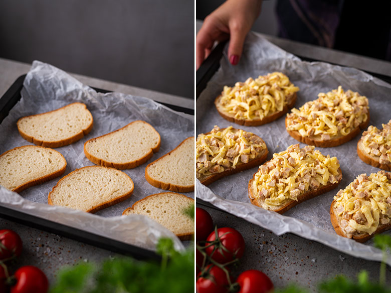 3. Batono riekeles aptepkite sviestu, ant viršaus paskirstykite vištienos ir sūrio masę.