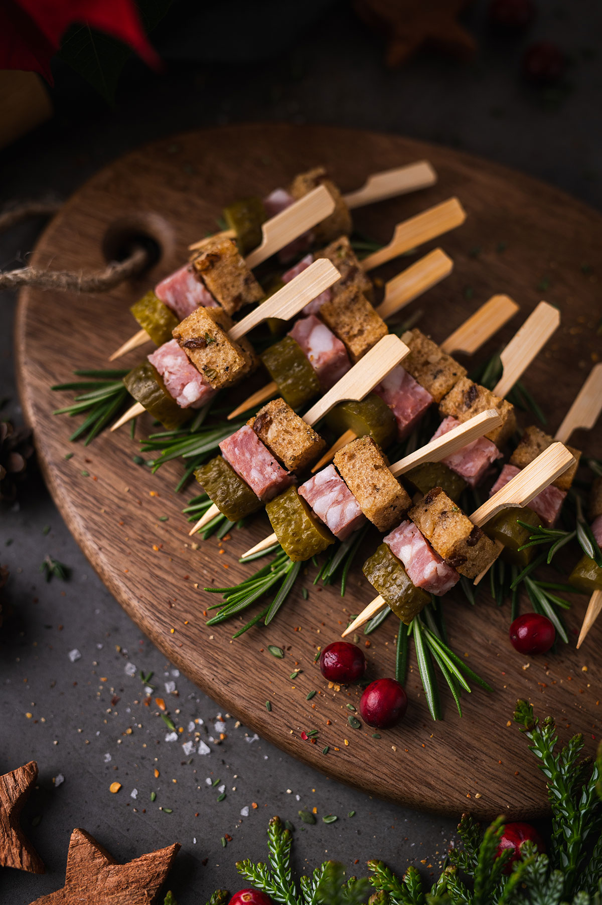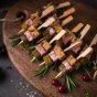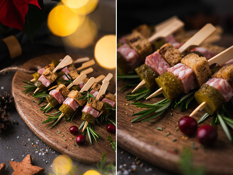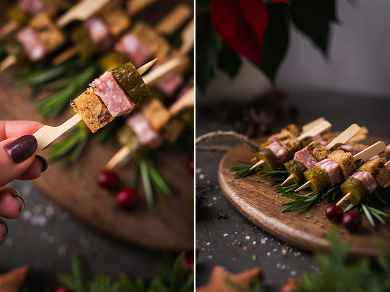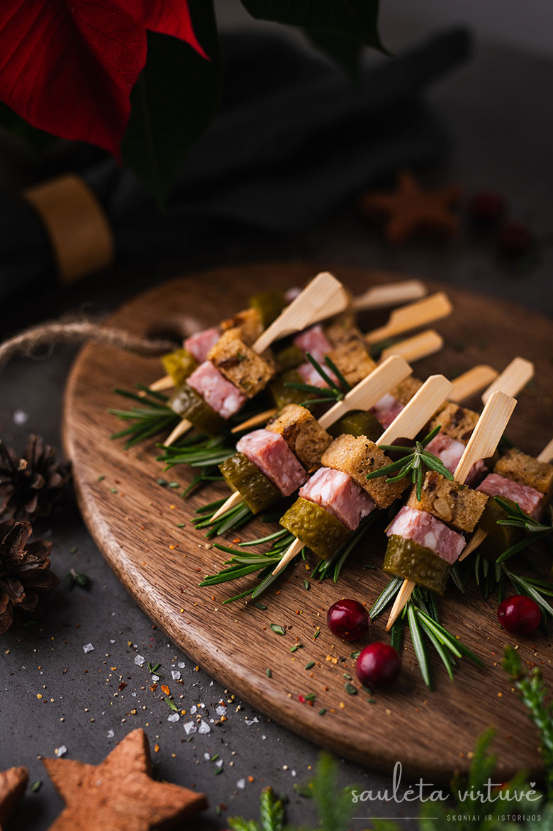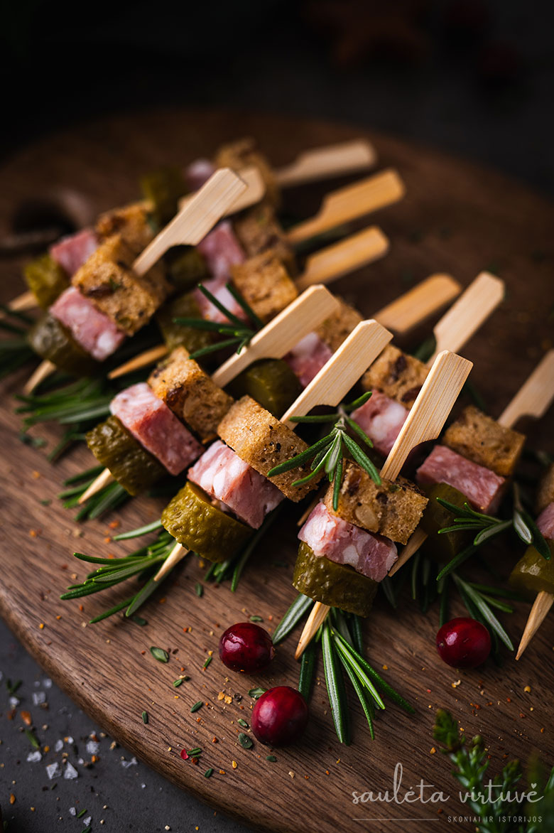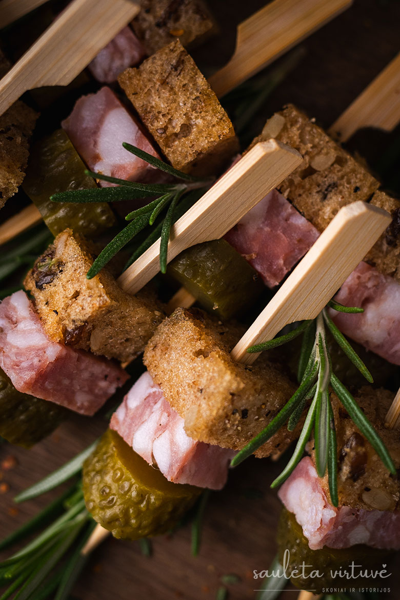 4. Ant nedidelių medinių iešmelių verkite po gabalėlį keptos duonos, skilandžio ir marinuoto agurko. Išdėliokite ant lėkštės ar lentelės ir patiekite.