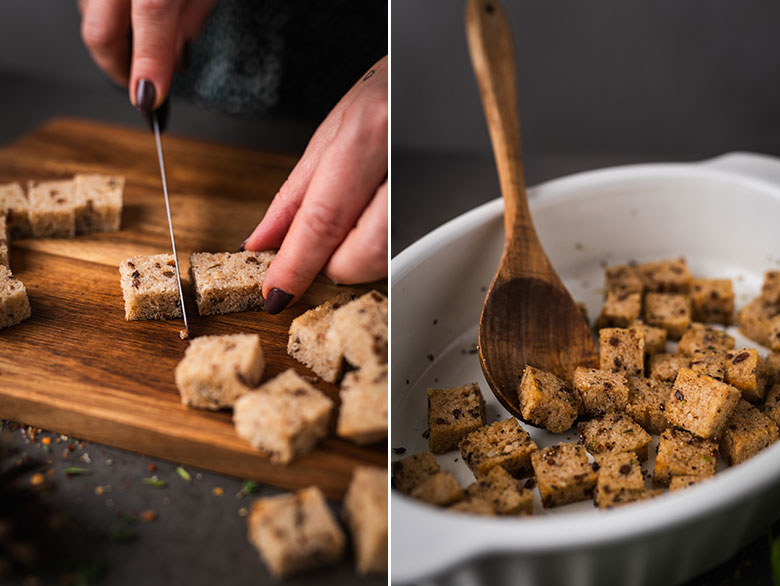 2. Duoną supjaustykite kubeliais. Suberkite į kepimo skardą, apšlakstykite aliejumi, pagardinkite prieskoniais ir išmaišykite. Kepkite įkaitintoje orkaitėje 10 minučių.