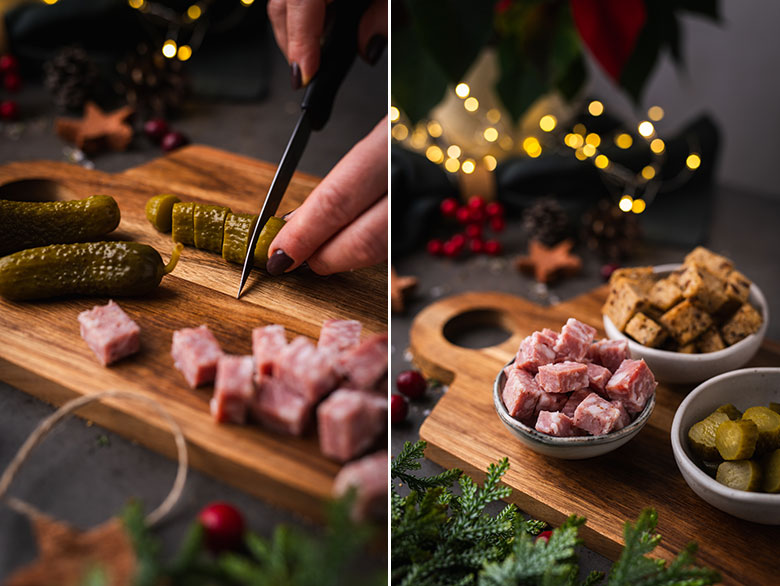 3. Skilandį supjaustykite kubeliais, nedidelius marinuotus agurkėlius – griežinėliais.
