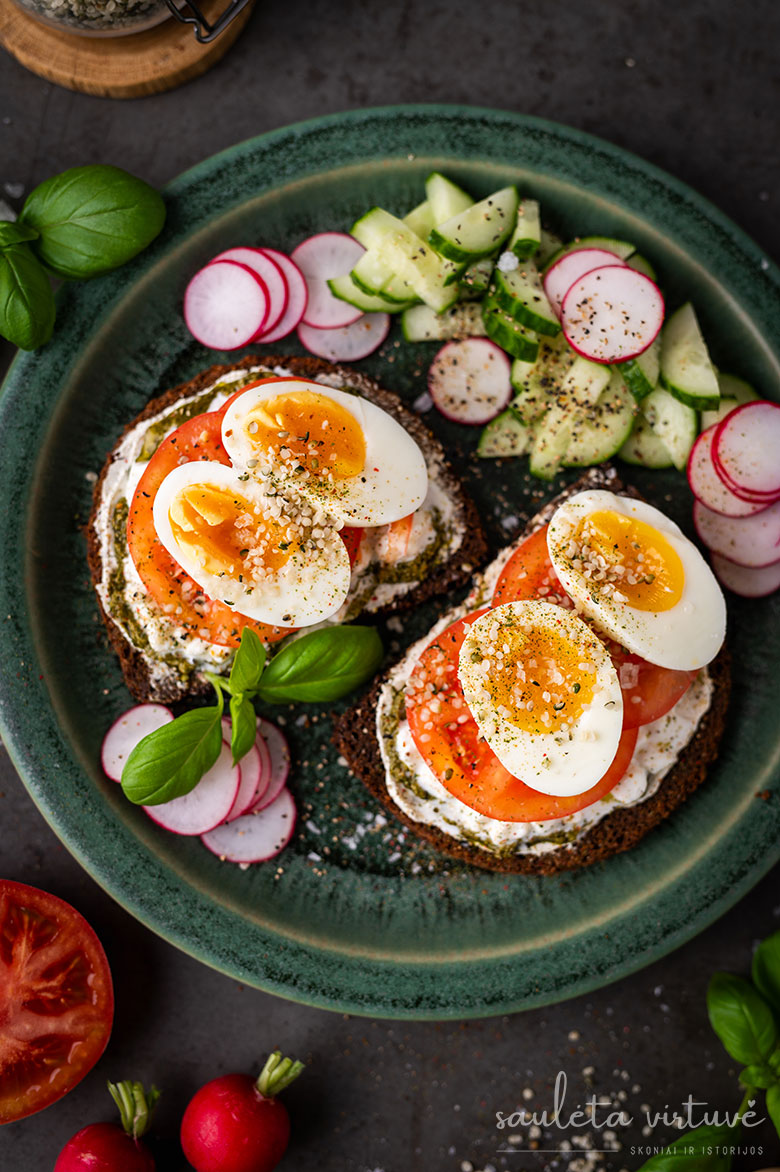 5. Ant viršaus dėkite po perpus perpjautą minkštai virtą kiaušinį ir apiberkite kanapių branduoliais.