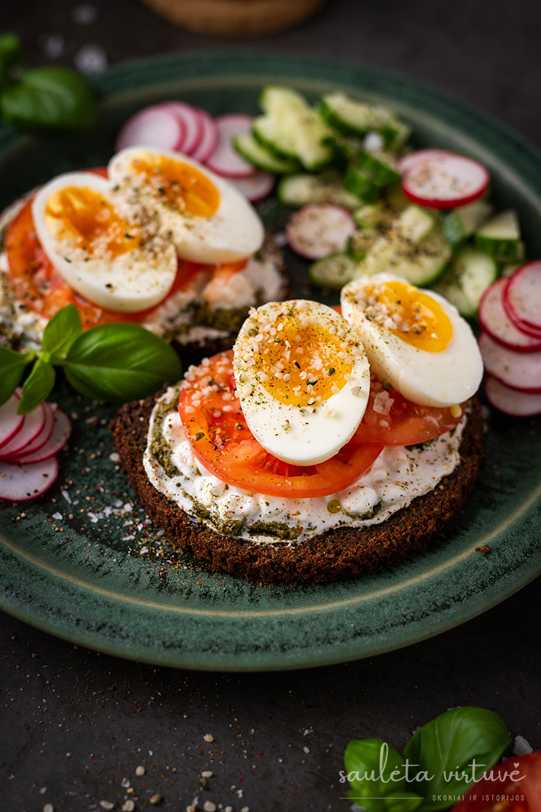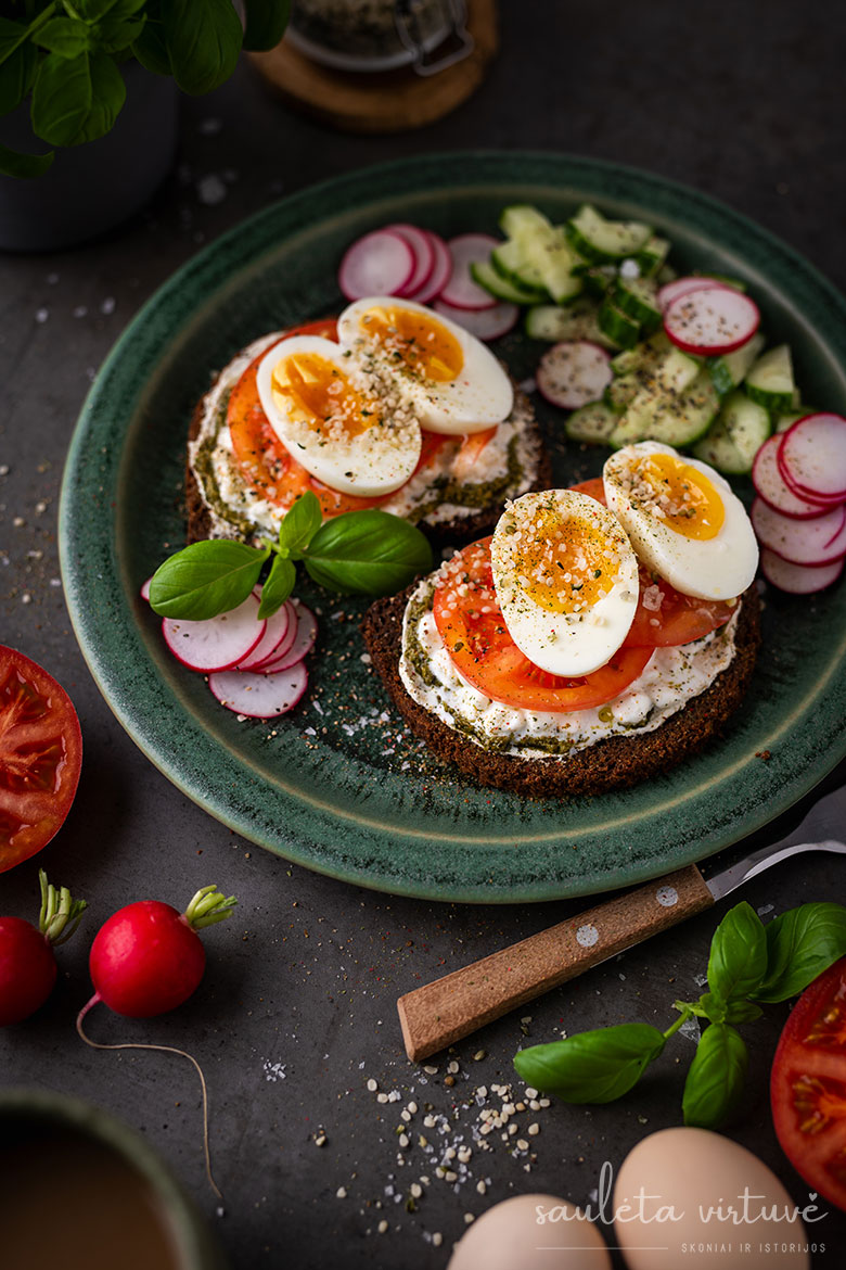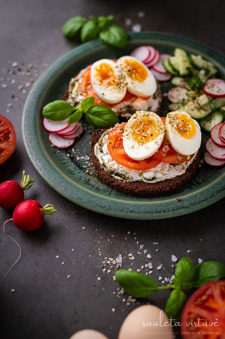 Sumuštiniai su grūdėta varške, pomidorais ir kiaušiniais
