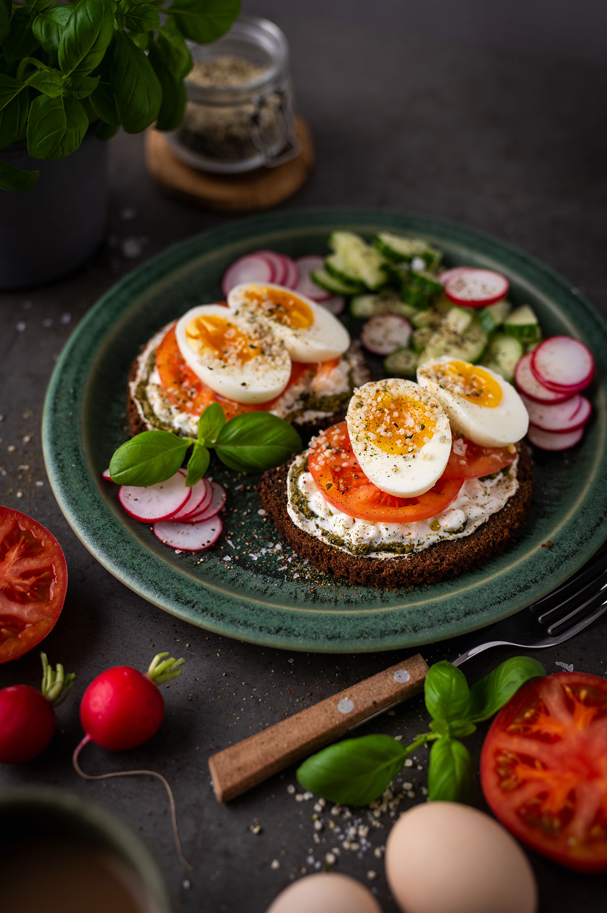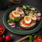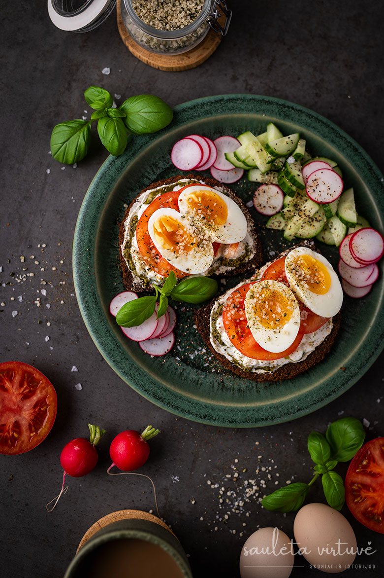 5. Ant viršaus dėkite po perpus perpjautą minkštai virtą kiaušinį ir apiberkite kanapių branduoliais.