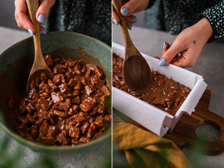 8. Kepimo formą išklokite kepimo popieriumi ar folija. Sukrėskite tinginio masę. Lengvai paspauskite delnais, kad neliktų oro tarpų.