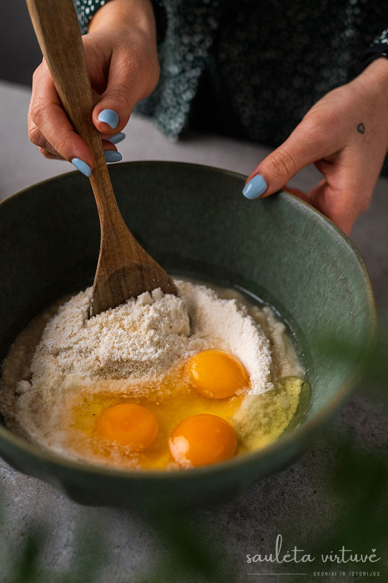 2. Visus sausainiui skirtus ingredientus sumaišykite ir išminkykite vientisą, lipnią tešlą.
