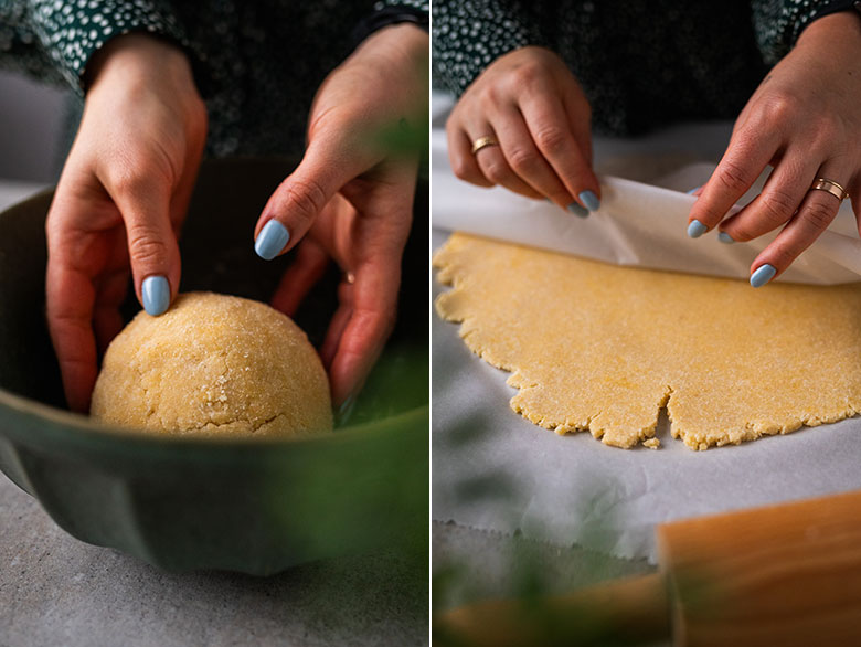 3. Dėkite tešlą tarp dviejų kepimo popieriaus lakštų ir iškočiokite į 0,3-0,5 cm storio sausainį. Nekreipkite dėmesio į formą, nelygius kraštus, bet stenkitės, kad visas sausainis būtų kuo vienodesnio storio ir keptų tolygiai.