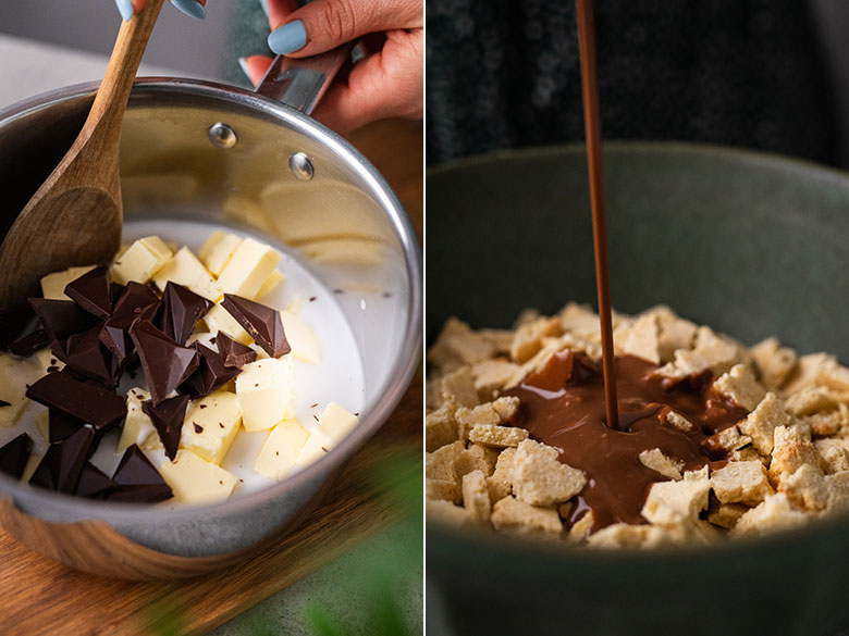 7. Gautą užpilą supilkite į dubenį su sausainiais. Išmaišykite, kol visi sausainių gabalėliai kuo tolygiau pasidengtų šokoladine mase.