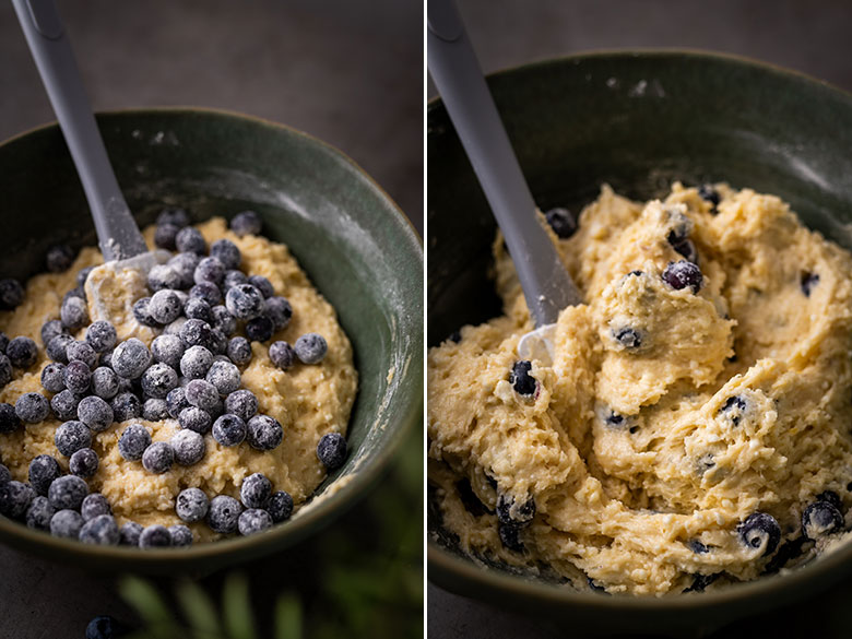 4. Šilauoges apvoliokite šaukšte miltų. Suberkite į tešlą ir lengvais judesiais įmaišykite, kad joje pasiskirstytų kuo tolygiau.