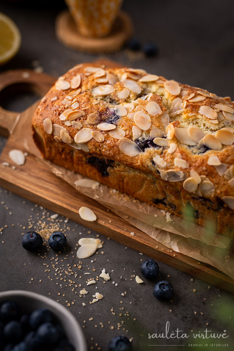 5. Paruoštą tešlą supilkite į kekso kepimo formą. Viršų apiberkite ruduoju cukrumi ir saujele migdolų riekelių.