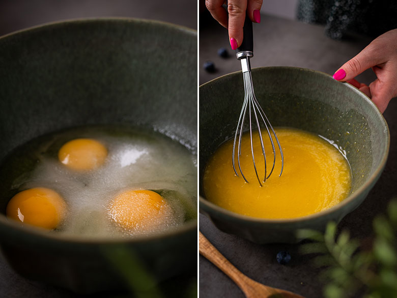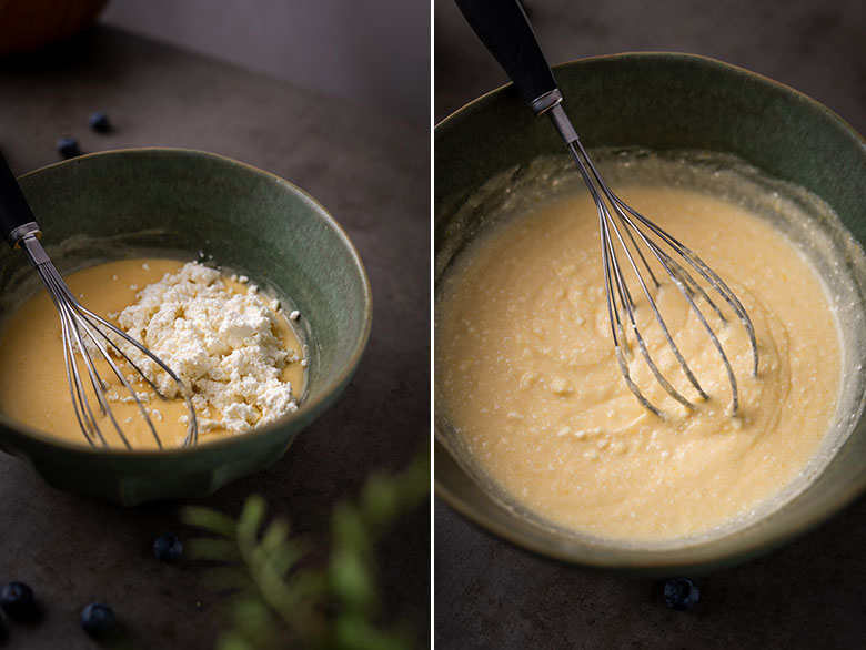 2. Kiaušinius, cukrų, vanilinį cukrų ir nutarkuotas citrinos žieveles plakite elektriniu plaktuvu apie 3-4 minutes iki purumo, kol cukrus ištirps, masė pabals ir taps tiršta. Toliau plakdami, supilkite tirpintą sviestą. Sudėkite varškę ir dar kartą gerai išplakite.