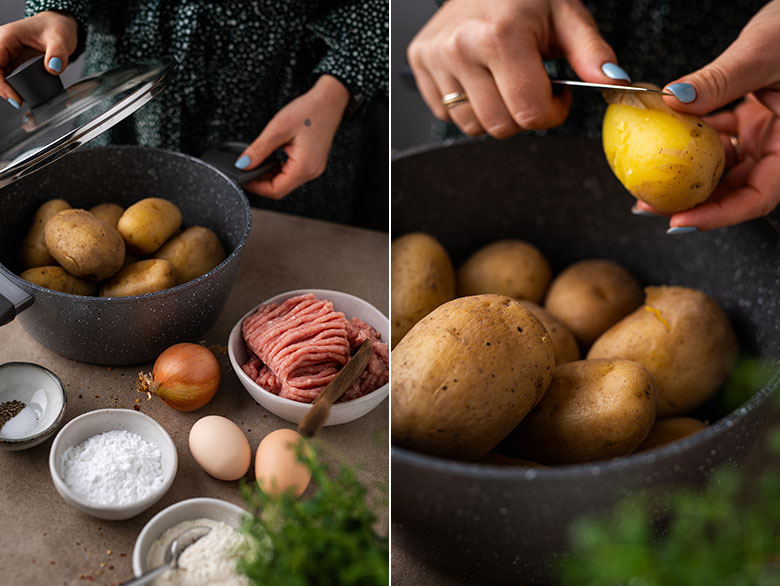 3. Paruoškite bulvių masę. Bulves švariai nuplaukite ir išvirkite su lupenomis. Nulupkite ir sutrinkite rankiniu trintuvu (svarbu: nenaudokite blenderio ar elektrinio trintuvo – bulvės virs „klijais“!). Šiek tiek atvėsinkite ir sumaišykite su kiaušiniais, krakmolu, miltais ir druska.