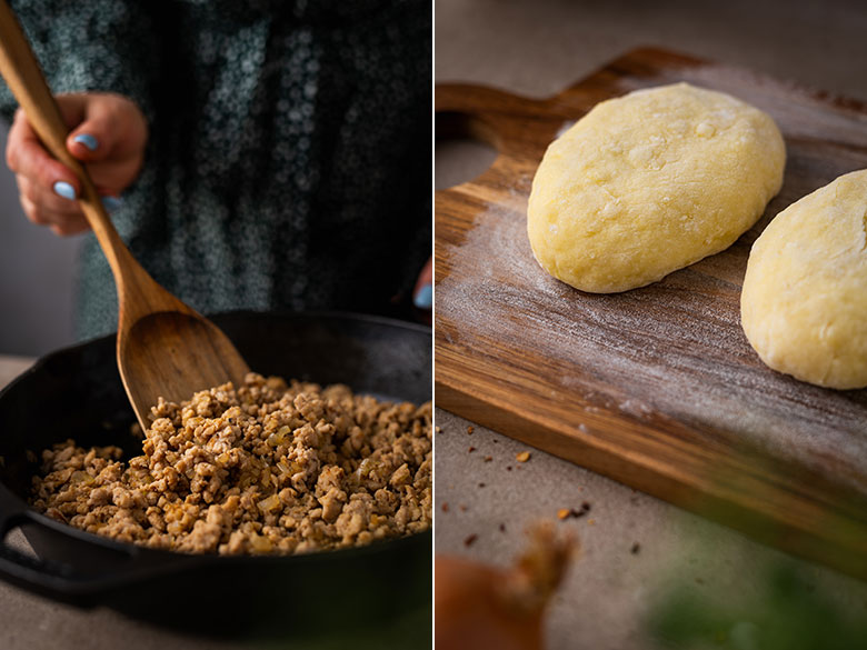 Iš tiesų viskas buvo kur kas paprasčiau nei galvojau. Išviriau bulves (su lupenomis!), o nuluptas sutryniau su kiaušiniu, miltais, krakmolu ir druska. Suformavusi paplotėlius, kiekvieno viduje paslėpiau po šaukštą keptos maltos vištienos. Drėgnais delnais pabandžiau suformuoti kuo gražesnės formos blynelius (šypt), o tada juos beliko iškepti keptuvėje.